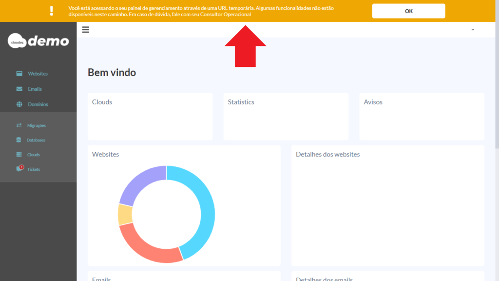 Isso quer dizer que você está acessando o seu painel por uma URL temporária. Esse aviso é importante, pois algumas funções no painel não funcionam de forma correta pela URL temporária.