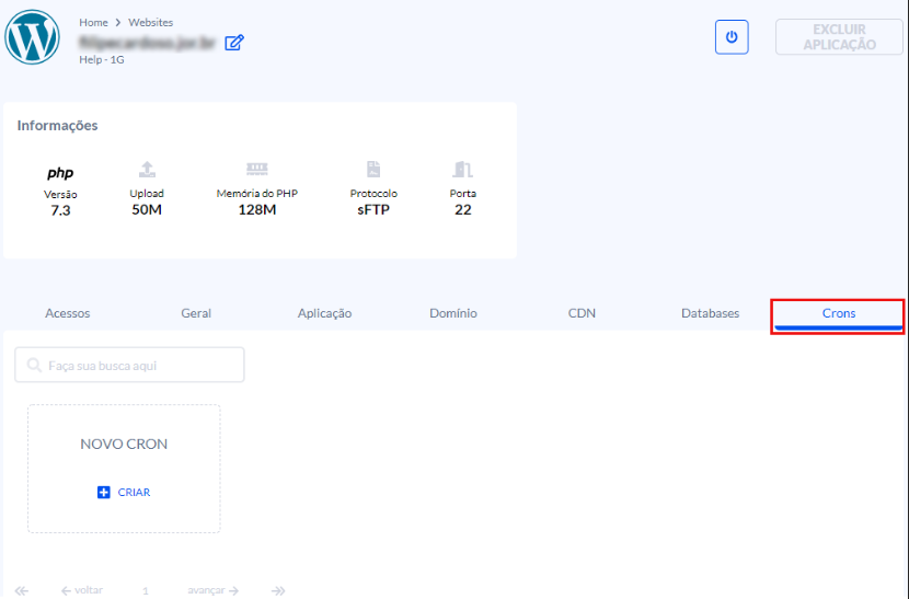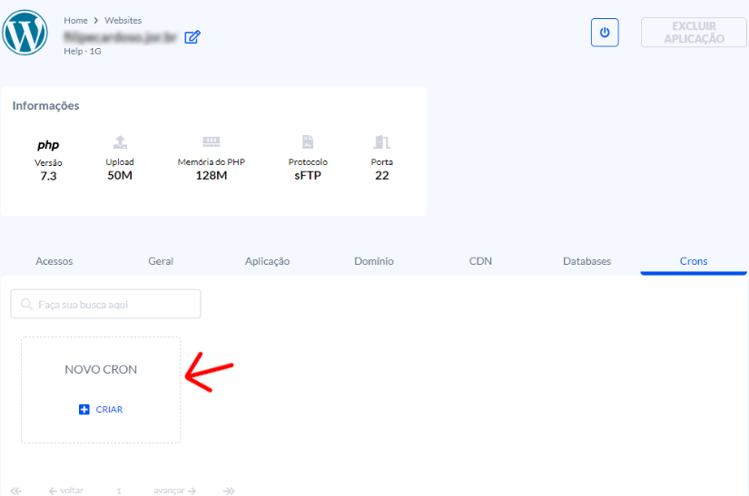 Na sua listagem de websites, localize e clique sobre o site que você deseja adicionar um Cron.