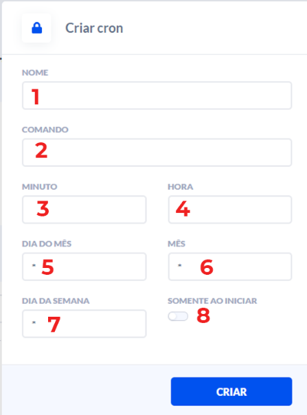 - (8) – Se você selecionar a opção Somente ao iniciar, o cron job será executado toda vez que a máquina (servidor) for iniciada;