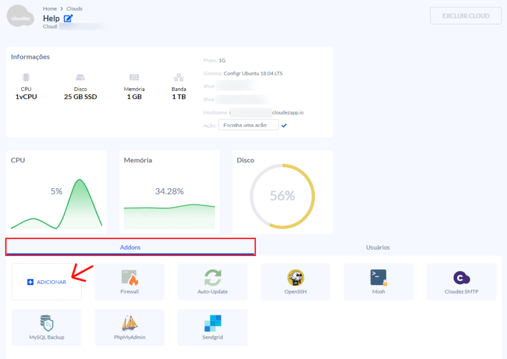 Na tela de detalhes do cloud, clique na aba Addons e depois, em Adicionar.