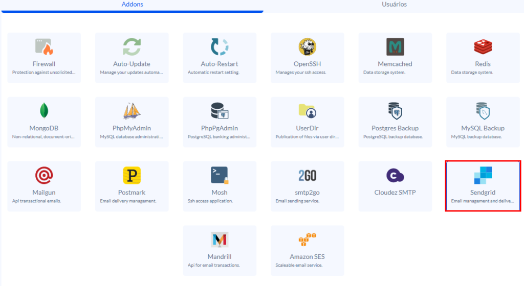 Na sequência, selecione o addon Sendgrid.