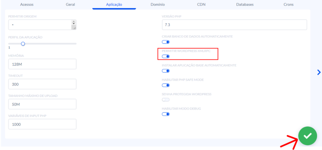 Na tela seguinte, localize a opção Permitir WordPress XMLRPC e a habilite.