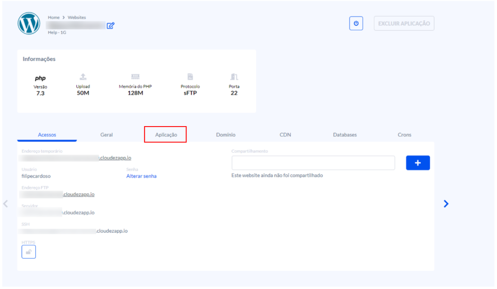 Na página de detalhes do site, clique na aba Aplicação.