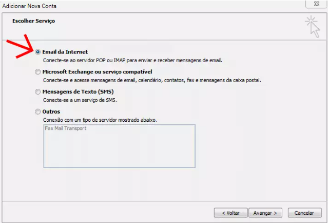 Em seguida, selecione “E-mail da Internet” e, em seguida, clique em “Avançar“.
