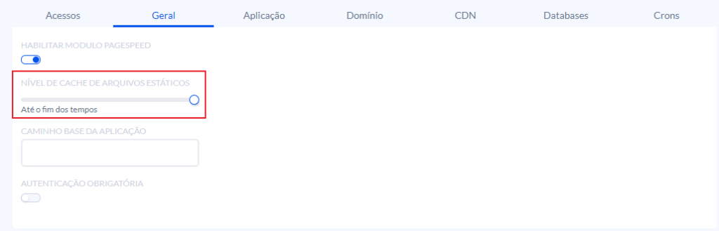 Na sequência, localize a opção Nível de cache de arquivos estáticos. Na barra horizontal você poderá escolher o nível de cache para seus arquivos.