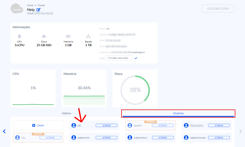 Na sua listagem de clouds, localize e clique sobre aquele que você deseja editar a senha do usuário.