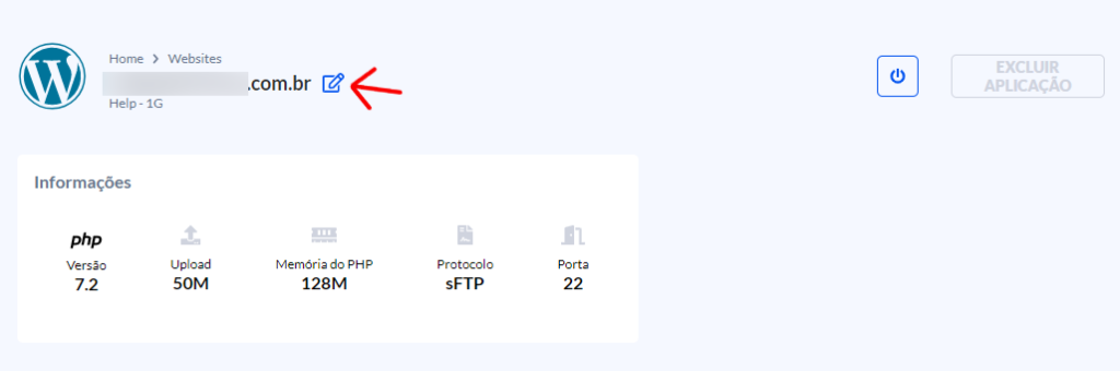 Na sua listagem de websites, localize e clique sobre aquele que deseja trocar o domínio.