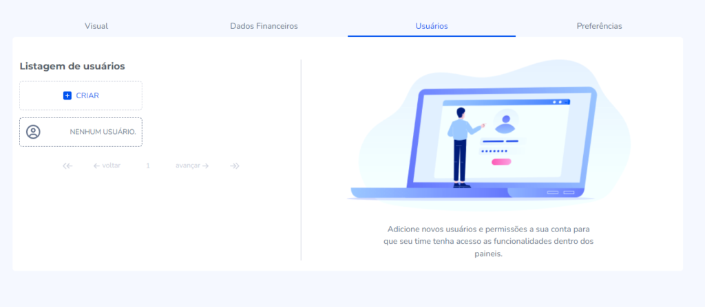 Dentro do painel “Empresa”, localize a aba “Usuários”. Na seção de Listagem de Usuários, clique em “Criar”.
