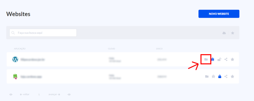Na sua listagem de websites, localize os ícones ao lado direito. Clique no ícone em formato de pasta, como mostrado na imagem abaixo.