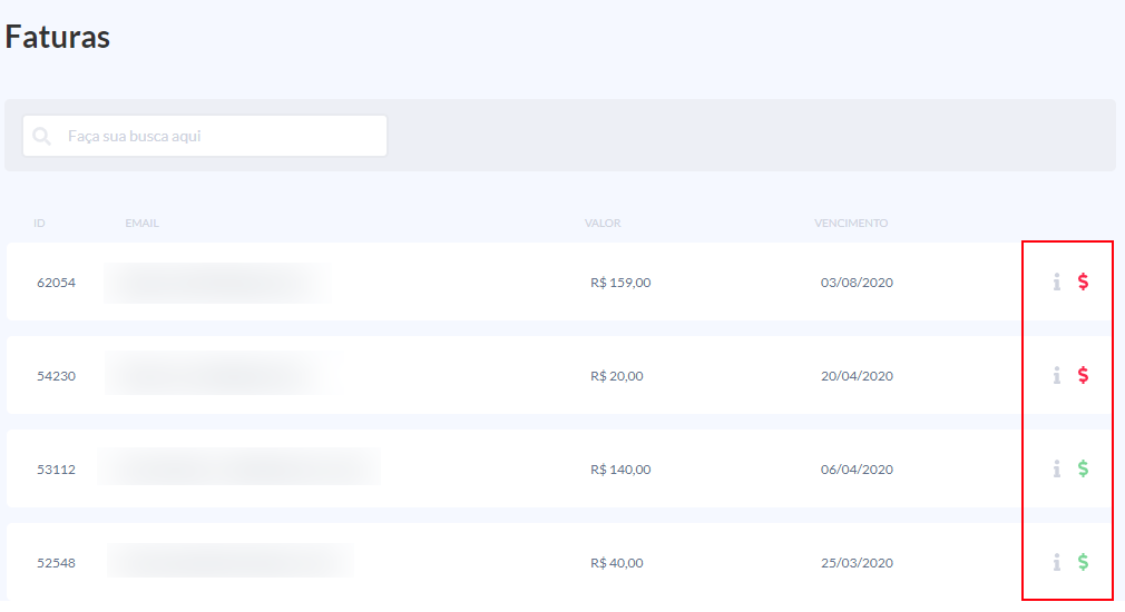 O cifrão verde significa que o pagamento já foi realizado. O cifrão vermelho significa que a fatura está com pagamento pendente.